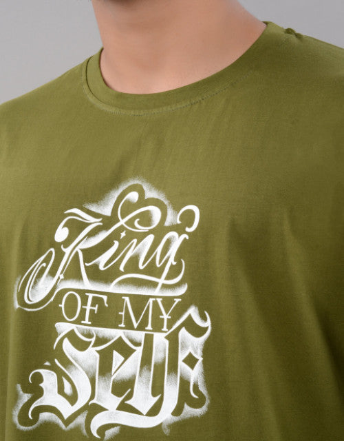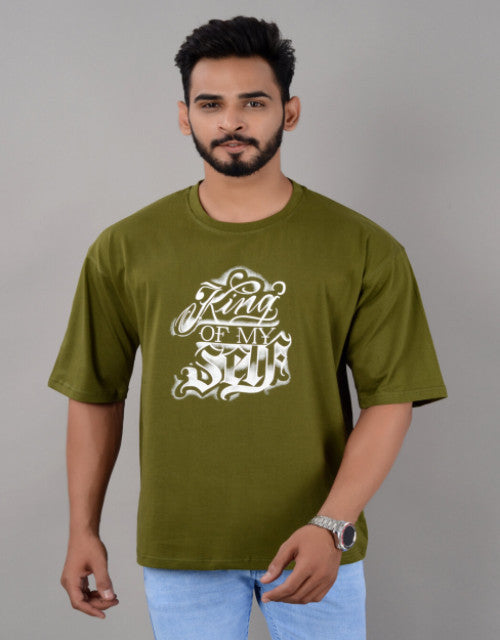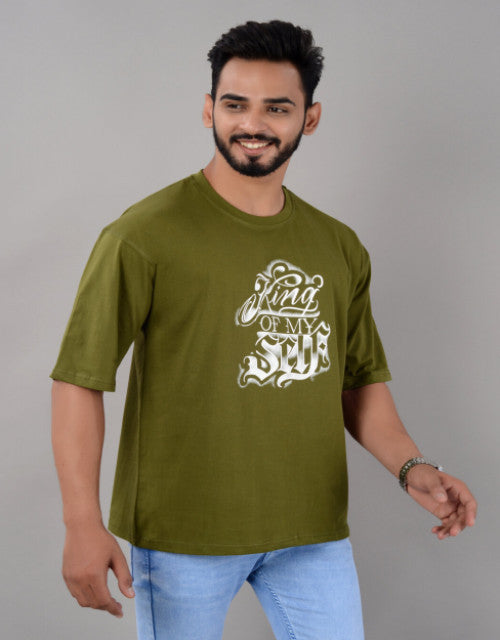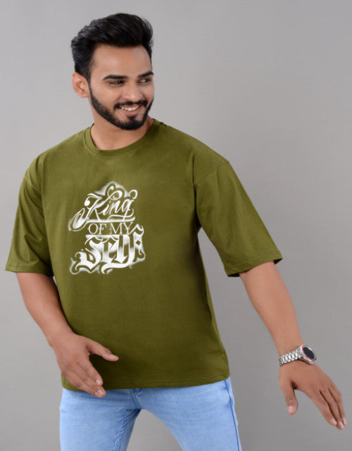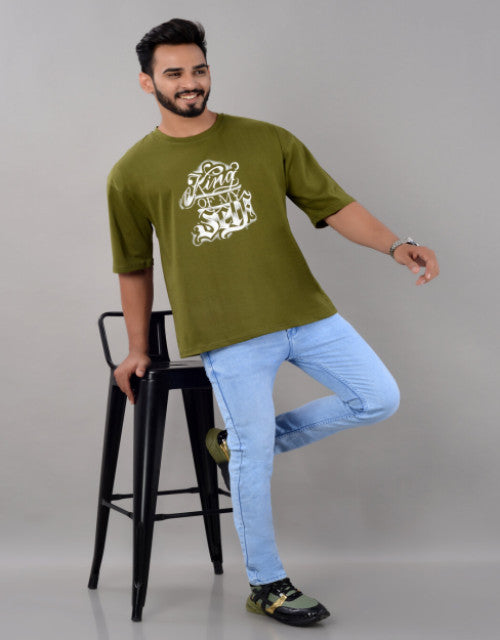 Cotton Blend Oversize Loose Fit Drop Shoulder Round Neck Half Sleeve Graphic Printed Olive T-Shirt for Men (SIZE- M,L,XL,XXL)